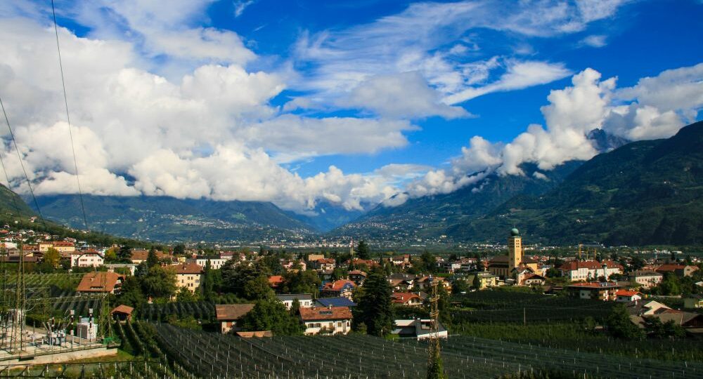 Plötzlich verändert sich die Atmosphäre. Der Asphalt bleibt zurück, der Weg wird schmaler und weicher, die Geräusche des Verkehrs verblassen. Stattdessen hört man Vogelgezwitscher, das Summen der Bienen und das Rascheln der Blätter im Wind. Rechts und links des Weges stehen Apfelbäume in Reih und Glied – im Frühling ein Meer aus weißen und rosa Blüten, im Herbst ein Paradies voller reifer, rotglänzender Früchte. Südtirol ohne Apfelbäume? Unvorstellbar! Immerhin gilt die Region als eines der größten Apfelanbaugebiete Europas.