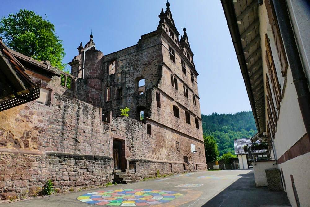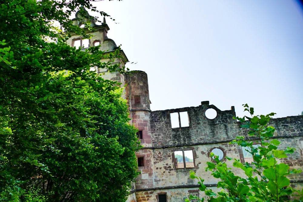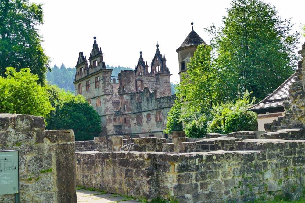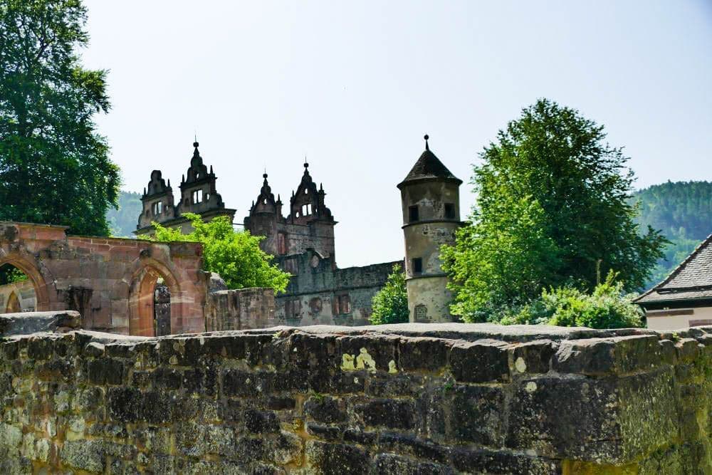 Ein historisches Steinschloss in Hirsau mit verschnörkelten Türmen und Bogenfenstern wird an einem sonnigen Tag teilweise von grünen Bäumen verdeckt und von alten Steinmauern umgeben.
