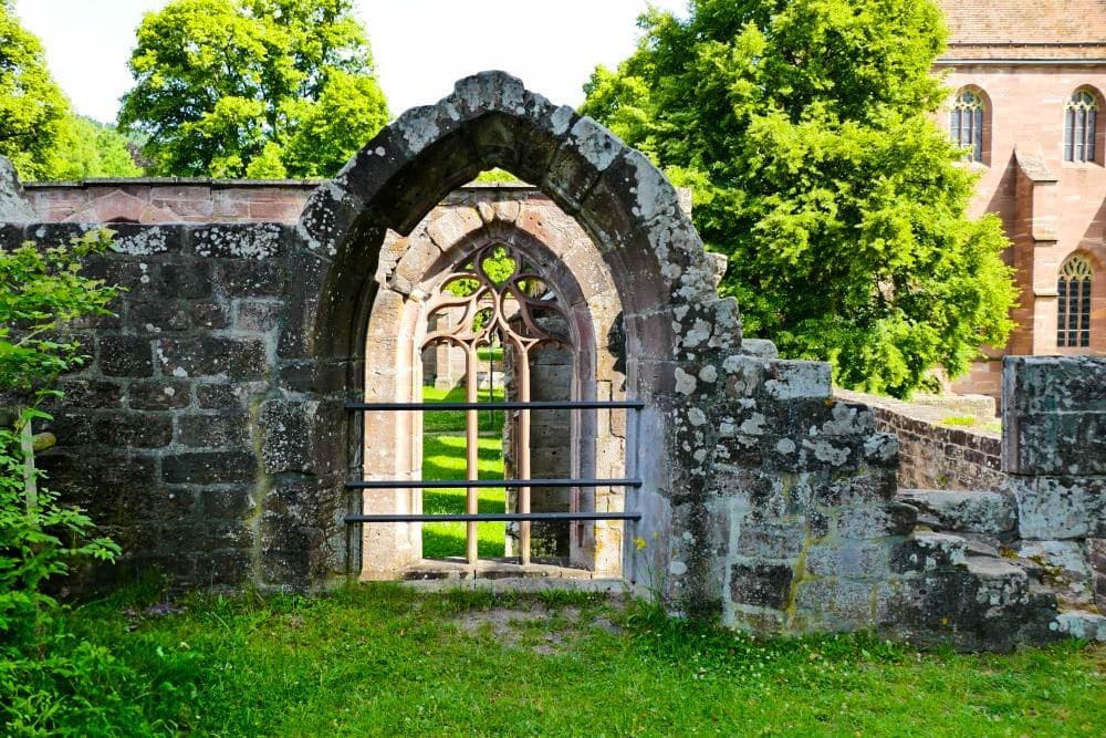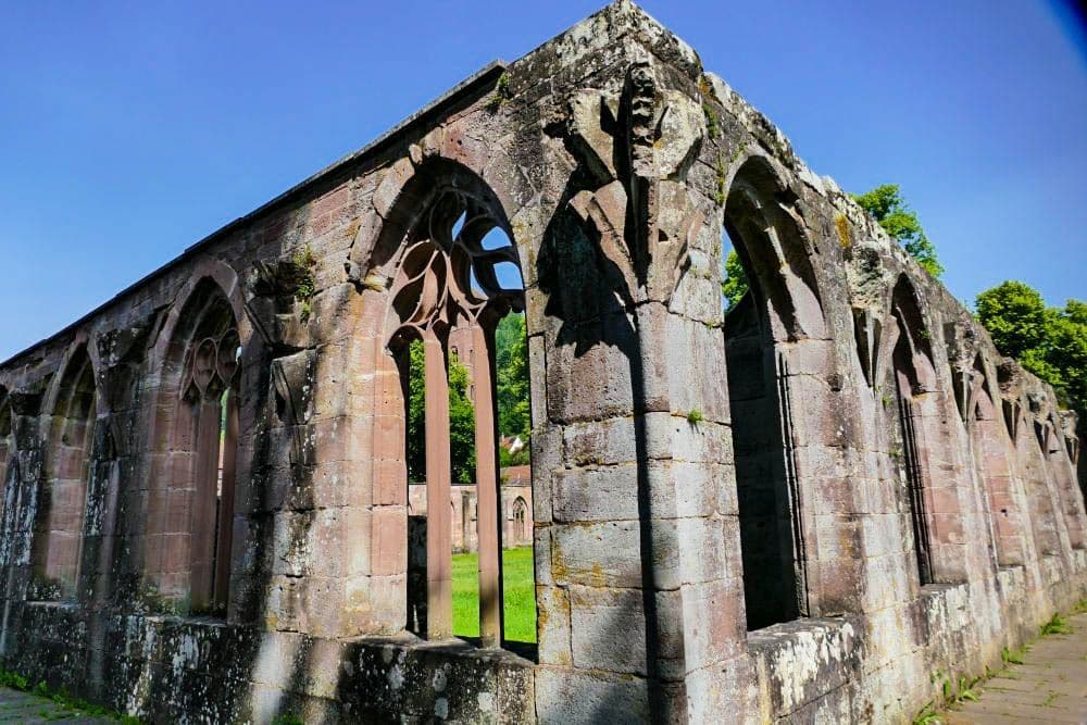 Auch die Überreste des Kreuzgangs sind sehenswert, und wenn Ihr Euch ein wenig Zeit nehmt, entdeckt Ihr immer wieder kleine Details – verzierte Steine, alte Fensteröffnungen oder Reste von Bögen. Gerade bei Sonnenschein entfaltet der rote Sandstein eine warme Farbe, die den Ort fast magisch erscheinen lässt. Ab und zu sieht man Besucher, die still zwischen den Mauern stehen und einfach den Moment genießen. Es ist ein Ort, der zum Nachdenken anregt und gleichzeitig eine gewisse Ruhe schenkt. Wer möchte, kann hier stundenlang verweilen, fotografieren oder einfach die Atmosphäre auf sich wirken lassen.