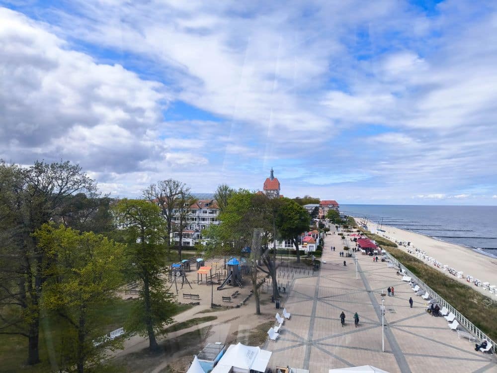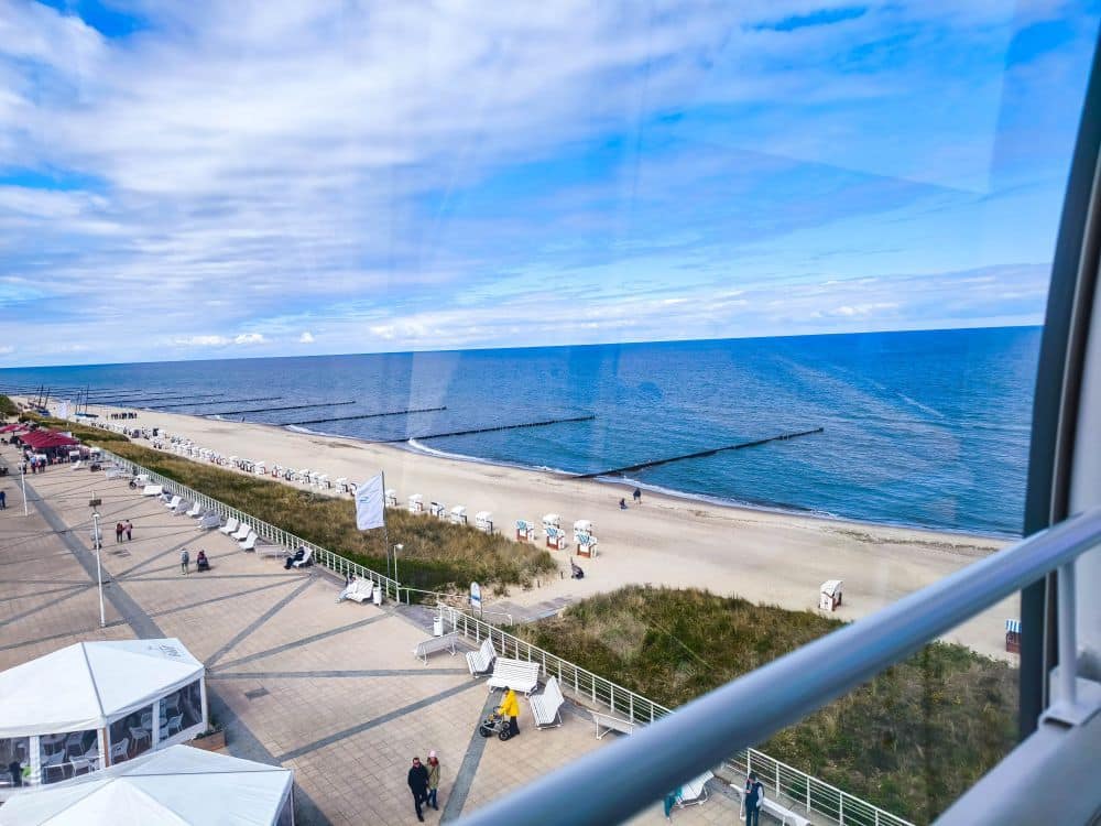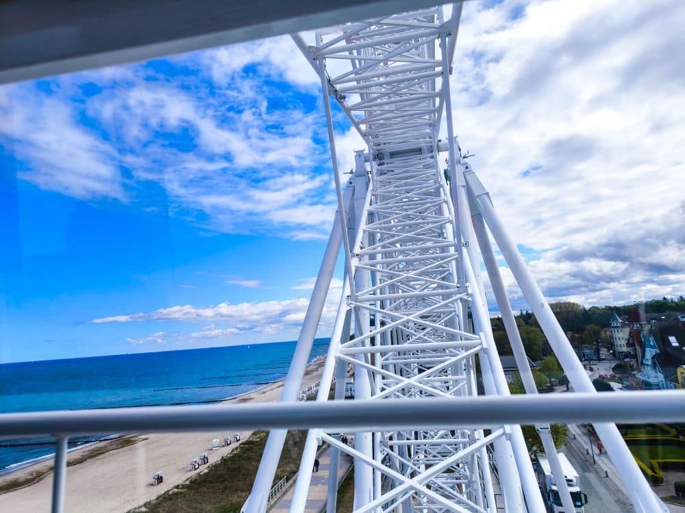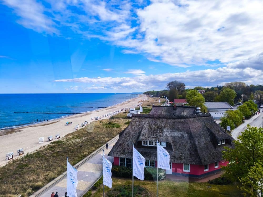 Doch das Riesenrad ist nicht nur ein nostalgischer Spaß, sondern auch eine fantastische Gelegenheit, Kühlungsborn aus einer völlig neuen Perspektive zu erleben. In luftiger Höhe eröffnet sich ein Panoramablick über die Dächer des Ortes, den kilometerlangen Strand, die Ostsee bis zum Horizont und das Hinterland mit seinen Feldern und Wäldern. Bei klarem Wetter kann man sogar bis zur Insel Poel oder nach Heiligendamm schauen.