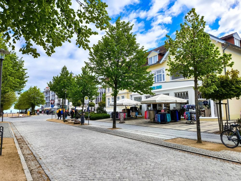 Hier ist immer etwas los: Radfahrer, Spaziergänger, Inlineskater, Familien mit Kinderwagen – alle genießen das entspannte Tempo und die frische Seeluft. Die Promenade ist sehr gepflegt, gesäumt von gepflegten Blumenrabatten, alten Bäumen, kleinen Cafés und Hotels in klassischer Bäderarchitektur. Immer wieder öffnen sich Blicke auf den feinsandigen Strand, der gleich hinter den Dünen liegt.