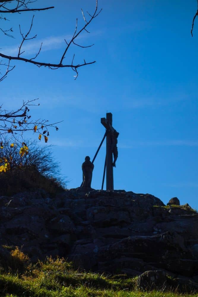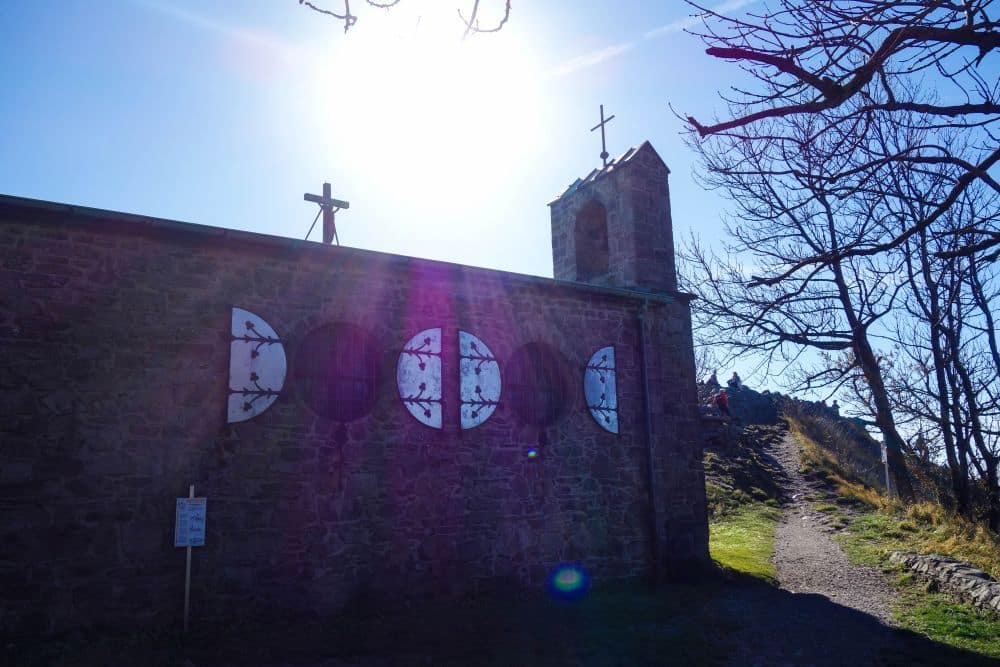 Der letzte Abschnitt bis zur Milseburg führt über einen schmalen, felsigen Pfad. Hier ist Konzentration gefragt, aber wer trittsicher ist, hat keinerlei Probleme. Die Belohnung wartet nur wenige Minuten entfernt: Der Gipfel der Milseburg mit seiner kleinen Kapelle, den Resten einer keltischen Fliehburg und drei Bergkreuzen.