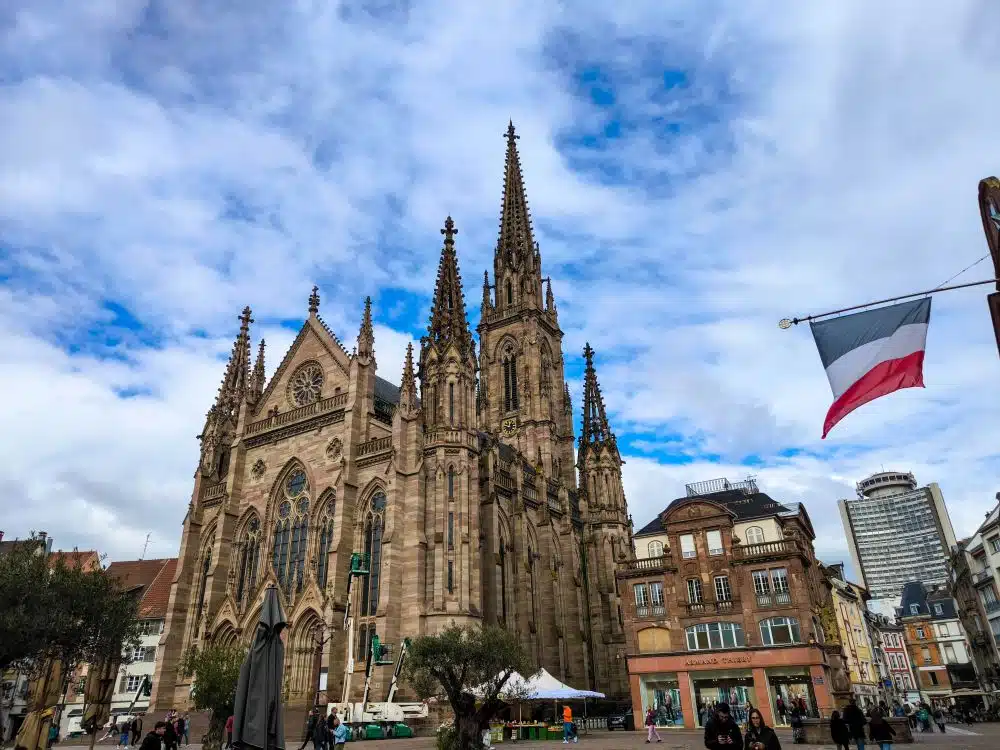 Eine große Kathedrale im gotischen Stil mit spitzen Türmen überragt einen Stadtplatz im Elsass. Menschen flanieren in der Nähe, rechts weht eine französische Flagge, und der Himmel ist teilweise bewölkt – eine Einladung, Mulhouse auf Ihrer Reise zu entdecken.