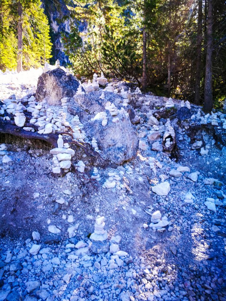Eine felsige Waldlichtung in der Nähe des Pragser Wildsees, gefüllt mit kleinen Stapeln weißer Steine im Sonnenlicht, umgeben von grünen Bäumen und vor der Kulisse hoch aufragender Felsen.