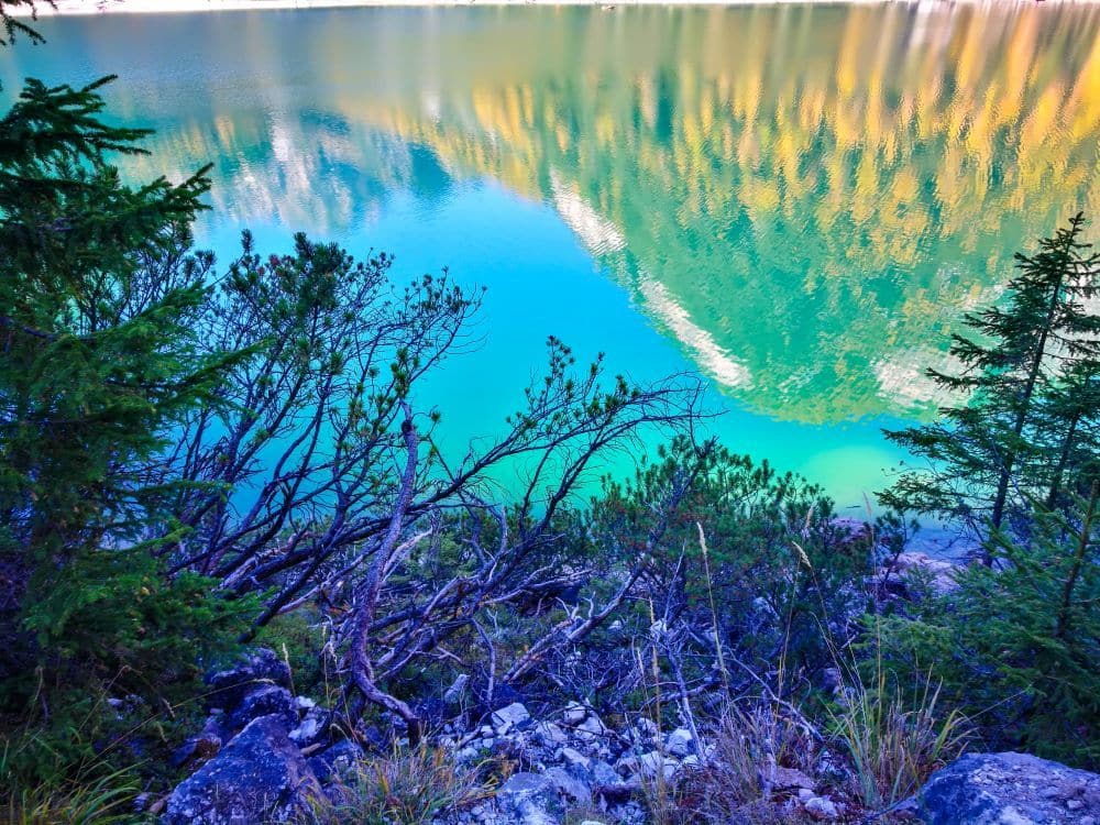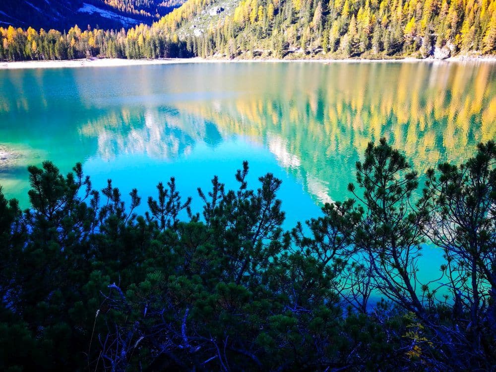 Ein klarer türkisfarbener See, wie der Pragser Wildsee, spiegelt gelbgrüne Bäume an einem sonnigen Hang wider, mit Sträuchern und Laub im Vordergrund. Im ruhigen Wasser spiegeln sich die leuchtenden Farben der Landschaft und des Himmels.
