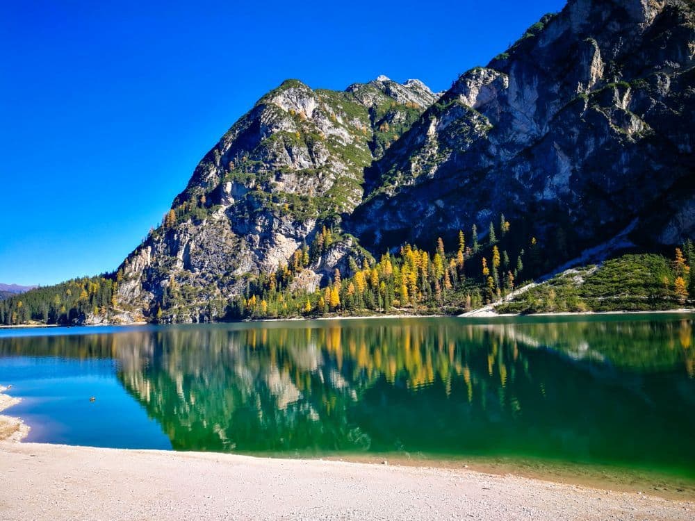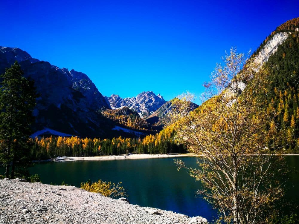 Ein klarer türkisfarbener See, der Pragser Wildsee, gesäumt von einem Wald aus grünen und gelben Bäumen, mit hohen felsigen Bergen im Hintergrund, die sich unter einem strahlend blauen Himmel erheben.