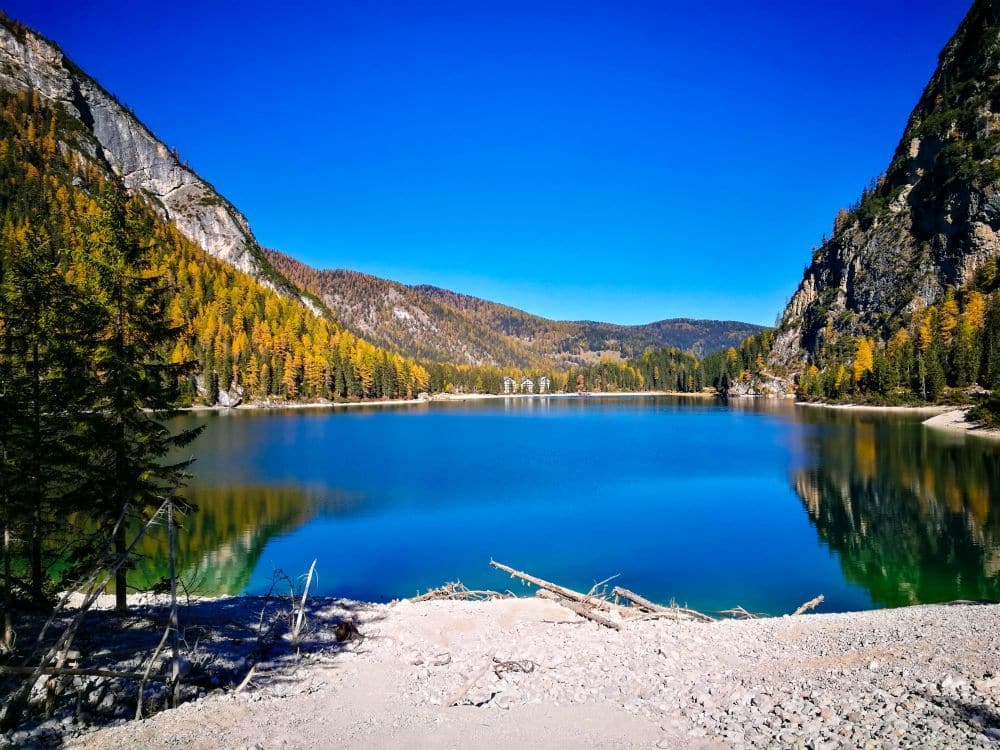 Ein klarer blauer See, bekannt als Pragser Wildsee, spiegelt die bunten Herbstbäume und Berge wider, und am anderen Ufer sind einige Gebäude unter einem strahlend blauen Himmel zu sehen.