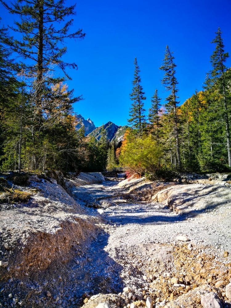 Wenn Ihr Euch für die Westseite entscheidet, erwartet Euch ein besonders eindrucksvolles Stück der Wanderung. Der Weg verläuft zunächst auf einem breiten Schotterpfad direkt am Ufer entlang. Hier habt Ihr eine der schönsten Perspektiven auf den See, denn die Wasserfläche reflektiert die steilen Wände des Seekofels und den weiten Himmel über Euch. Je nach Tageszeit verändert sich das Bild ständig. Morgens herrscht eine klare, fast mystische Stille, mittags funkelt das Wasser in kräftigem Türkis, und am späten Nachmittag tauchen lange Schatten die Szenerie in ein sanftes, melancholisches Licht.