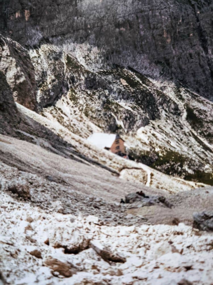 Von der Rifugio Toni Demetz beginnt der Abstieg in die Langkofelscharte direkt mit einem landschaftlichen Paukenschlag. Vor Euch öffnet sich ein schmaler, steil eingeschnittener Korridor aus hellgrauem Dolomitenkalk, dessen Wände so hoch aufragen, dass sie den Blick in den Himmel zu einem schmalen Spalt verengen. Der Weg fällt sofort steil ab, und der Untergrund besteht fast ausschließlich aus losem Geröll.